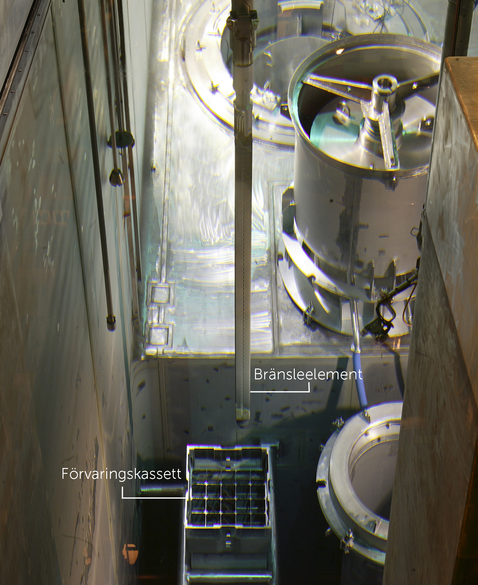 Det använda kärnbränslet förvaras i djupa vattenbassänger. Åtta meter vatten skyddar mot strålningen. Foto: Curt-Robert Lindqvist.