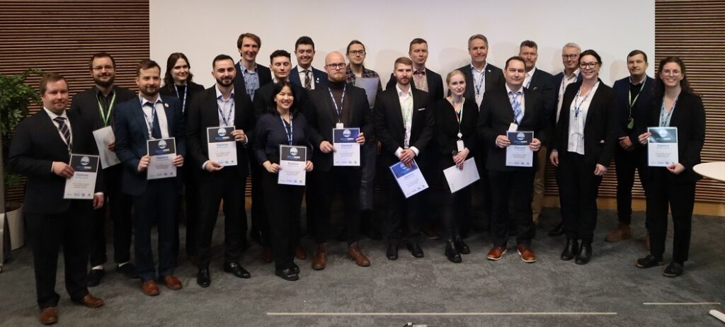 Gruppbild från diplomeringen på Fortums huvudkvarter i Helsingfors. På bilden finns även vd för Uniper Johan Svenningsson, Jarmo Tanhua vd för TVO, Vice vd Petra Lundström från Fortum, Sara Sahl ansvarig för traineeprogrammet och sist men inte minst Torbjörn Wahlborg, chef för Business Area Generation.