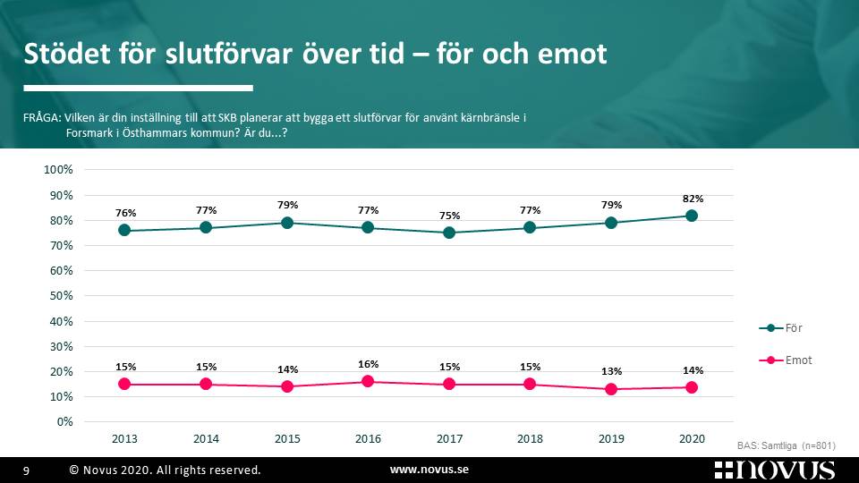 Varje år mäter Novus på uppdrag av SKB opinionen i de kommuner som omfattas av planerna för den framtida hanteringen av Sveriges använda kärnbränsle. I år svarar 82 procent av de tillfrågade i Östhammars kommun att de är för SKB:s planer på att det svenska slutförvaret för använt kärnbränsle ska byggas i Forsmark. 2019 var motsvarande siffra 79 procent och 2018 var den 77 procent.