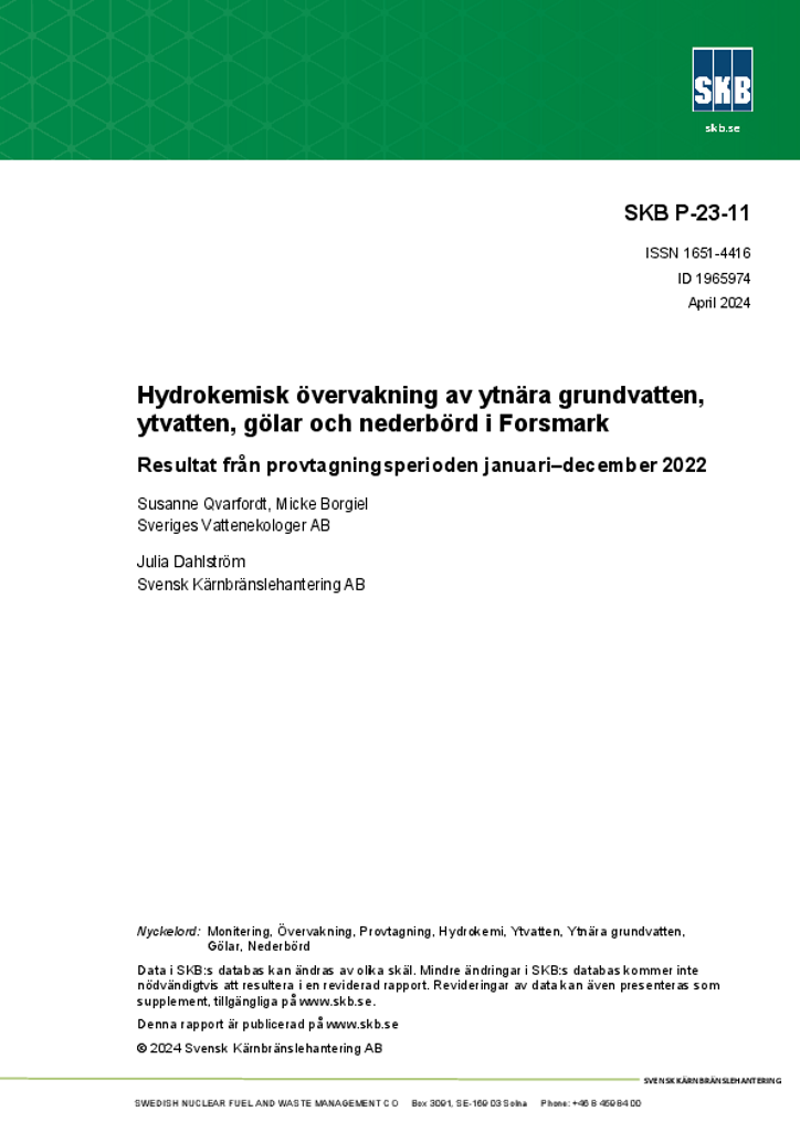 Hydrokemisk övervakning av ytnära grundvatten, ytvatten, gölar och nederbörd i Forsmark. Resultat från provtagningsperioden januari-december 2022