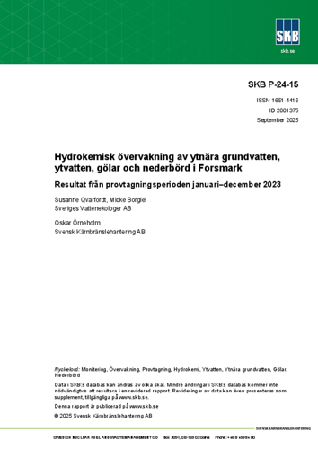 Hydrokemisk övervakning av ytnära grundvatten, ytvatten, gölar och nederbörd i Forsmark. Resultat från provtagningsperioden januari-december 2023